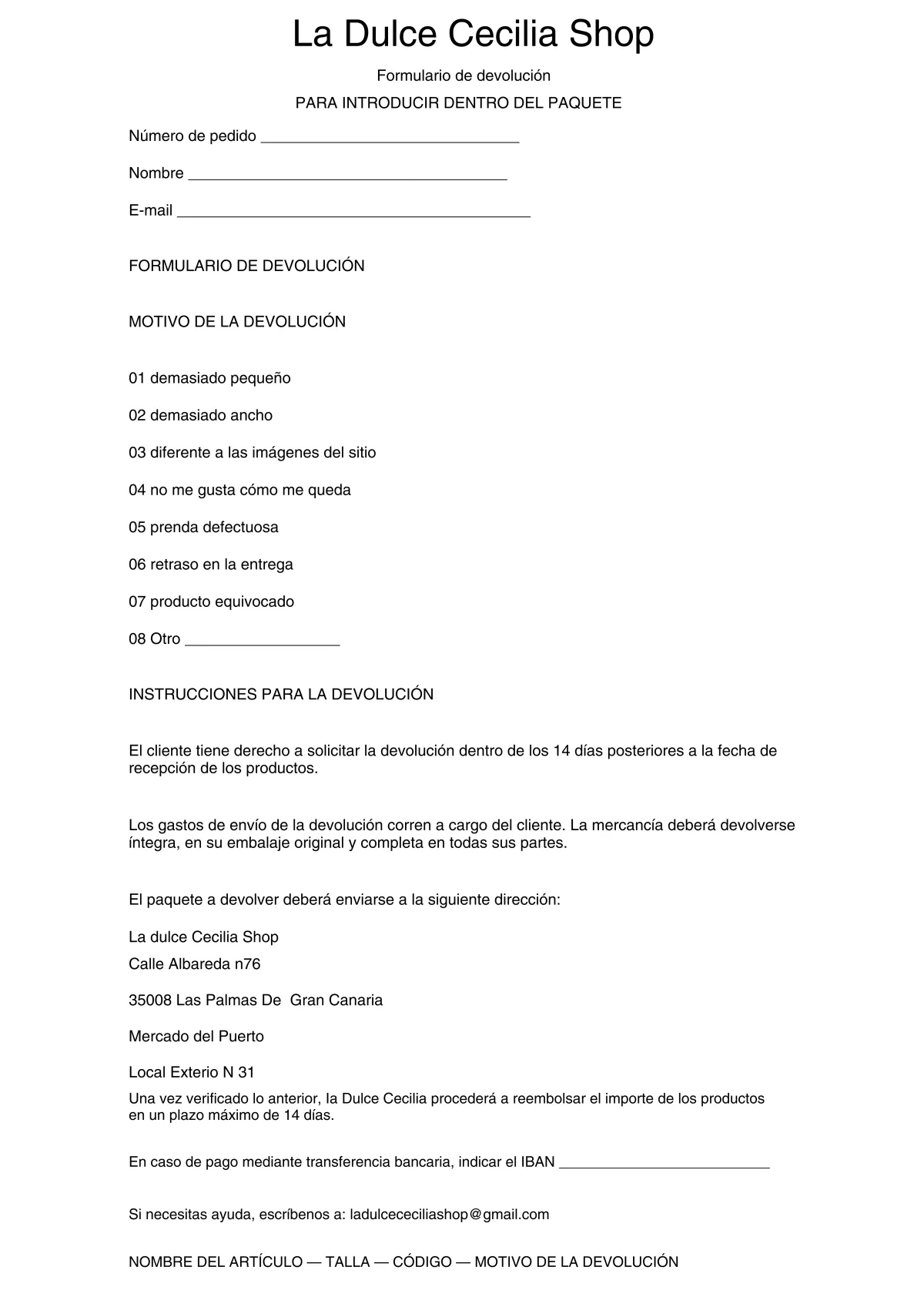 La Dulce Cecilia Shop realiza envíos exclusivamente a las Islas Canarias. (no enviamo a península)